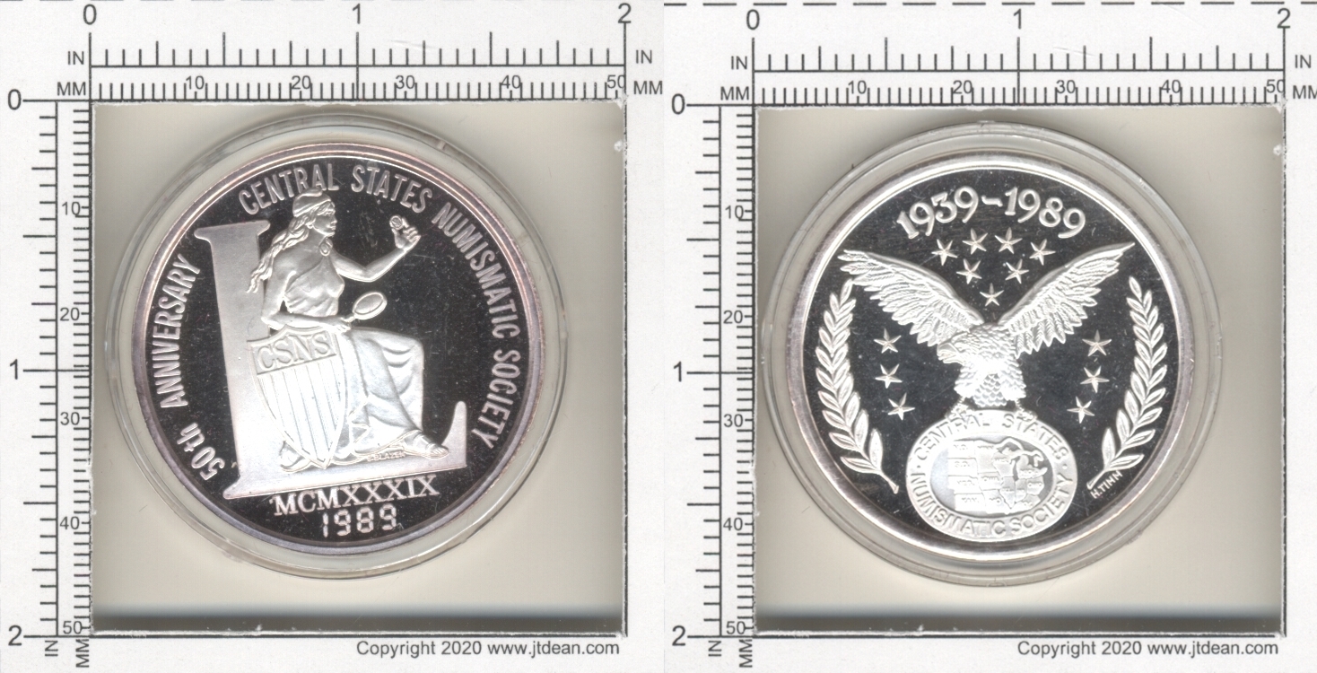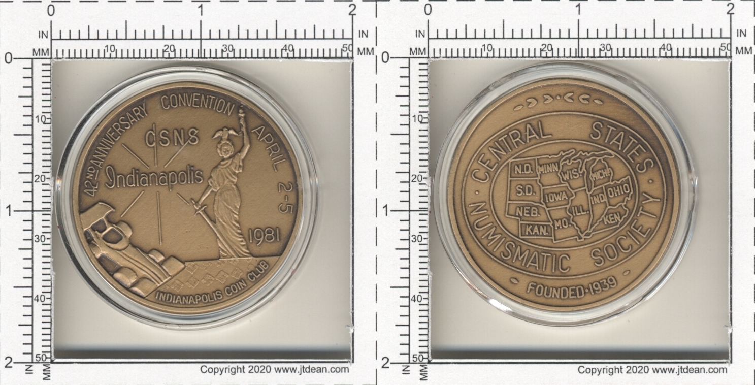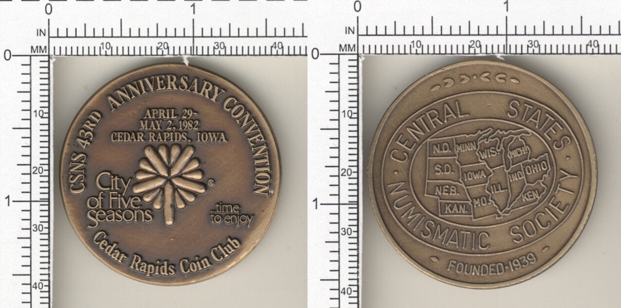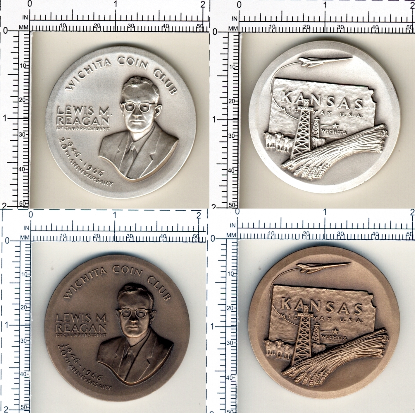 1966 Wichita Coin Club 20th Anniversary Medals (Silver & Bronze). Both Medals are edge numbered 25. Medals are 45mm in diameter. Silver medal weighs 54.3 grams and is edge marked "Medallic Art Co, NY, 999+ Fine Silver". Bronze medal is also marked "Medallic Art Co, NY". A nice pair of medals, and probably not often found numbered and together!