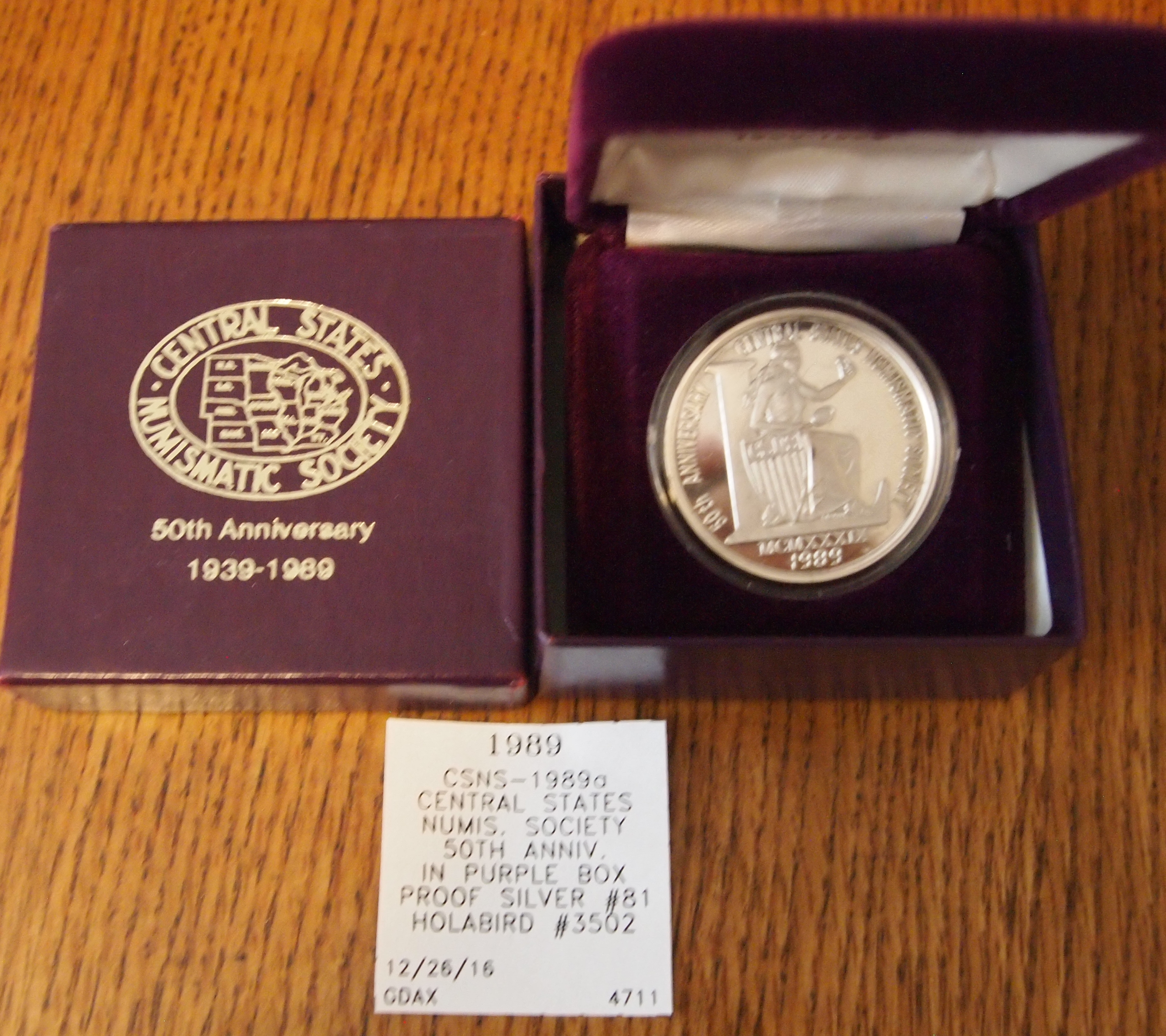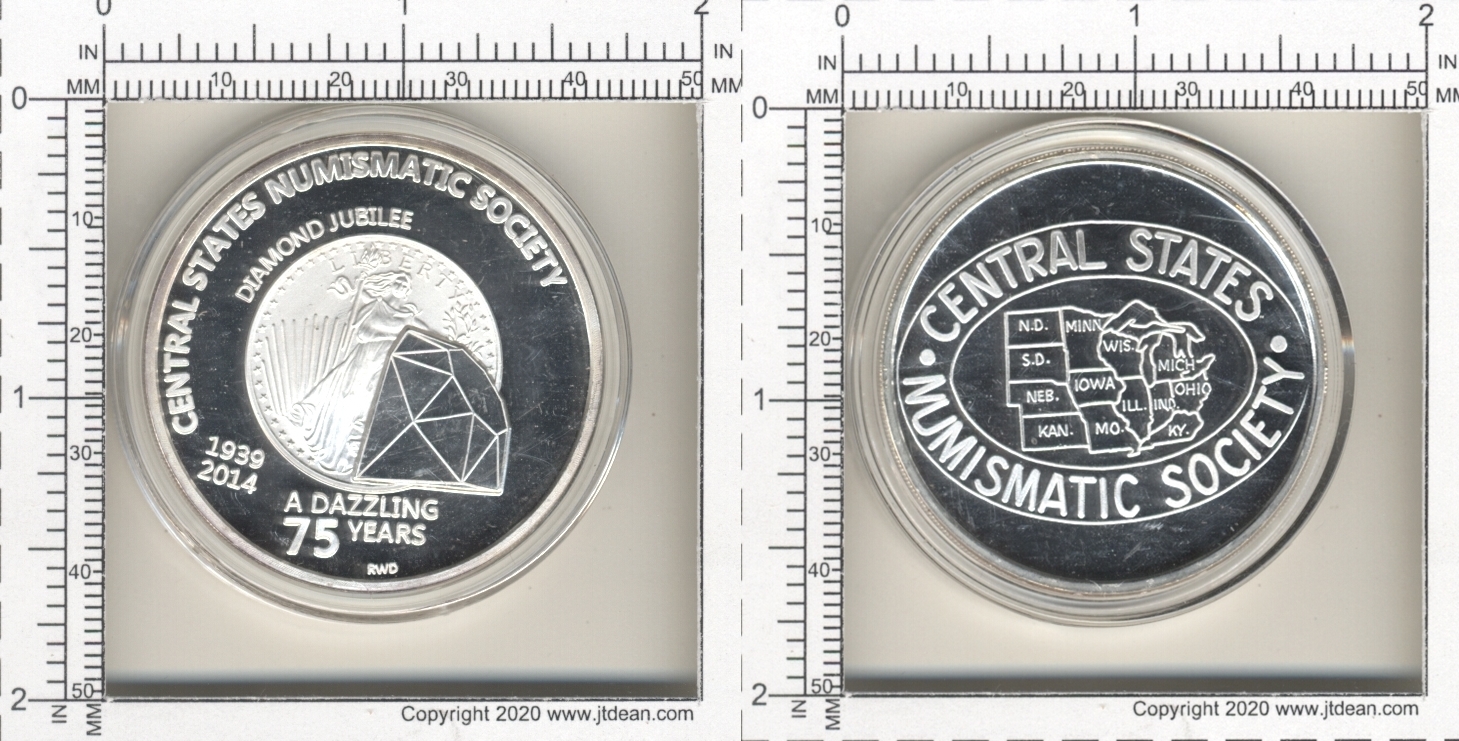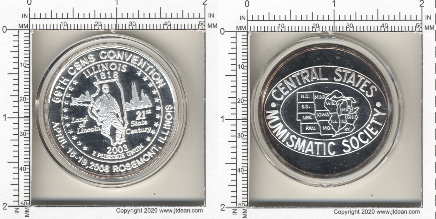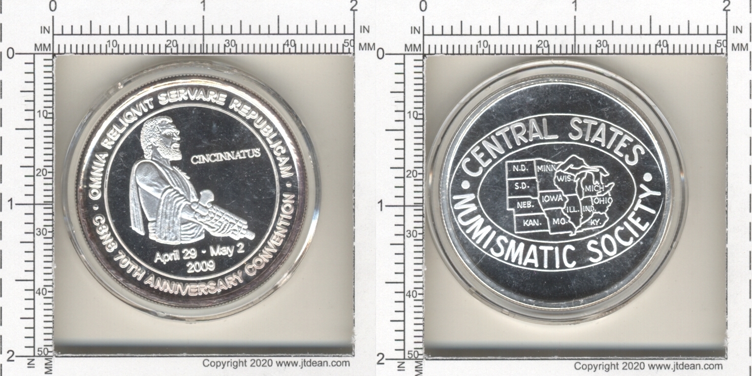 1966 Wichita Coin Club 20th Anniversary Medals (Silver & Bronze). Both Medals are edge numbered 25. Medals are 45mm in diameter. Silver medal weighs 54.3 grams and is edge marked "Medallic Art Co, NY, 999+ Fine Silver". Bronze medal is also marked "Medallic Art Co, NY". A nice pair of medals, and probably not often found numbered and together!