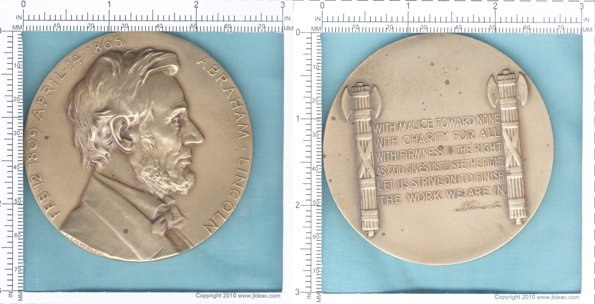 Lincoln Medal by Calverly. Struck by Medallic Art Company, ~2-3/4" diameter (69mm), Bronze. Obverse shows Lincoln bust facing right, with birth/death dates around edge. Reverse shows Lincoln's "With Malice Toward None" statement.
