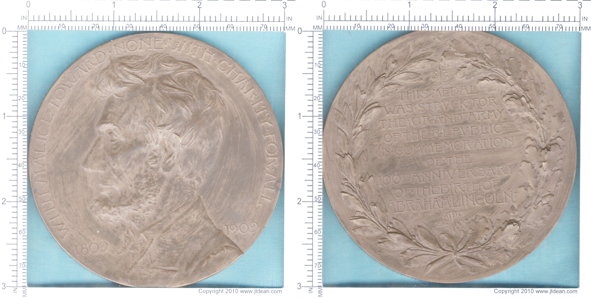 Lincoln Grand Army of the Republic (GAR) Centennial Medal, Bronze, 3 in. diameter. Darker surfaces.
