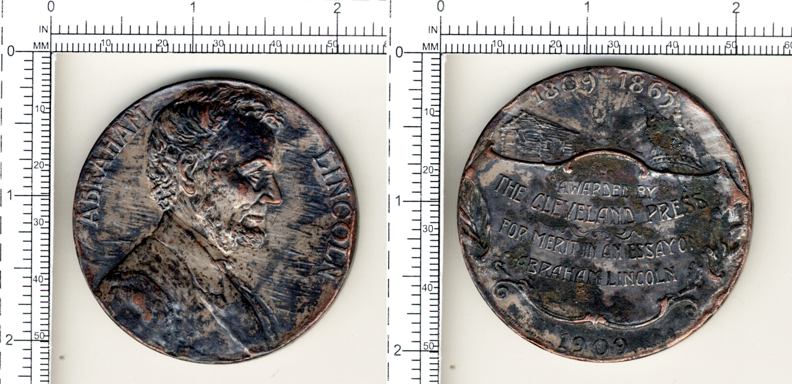 1809-1865 Awardedv by the Lincoln Press for Merit in an Essay on Abraham Lincoln - Silvered Bronze - very dark and dirty - Poor Condition