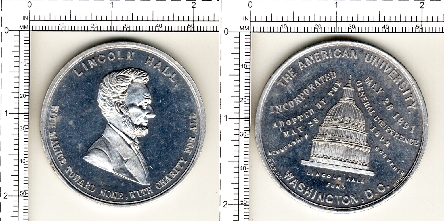 A Lincoln piece by George H. Lovett. Lincoln Hall, With Malice Toward None, With Charity For All. The American University, Incorporated May 28, 1891. A Nice High Grade medal