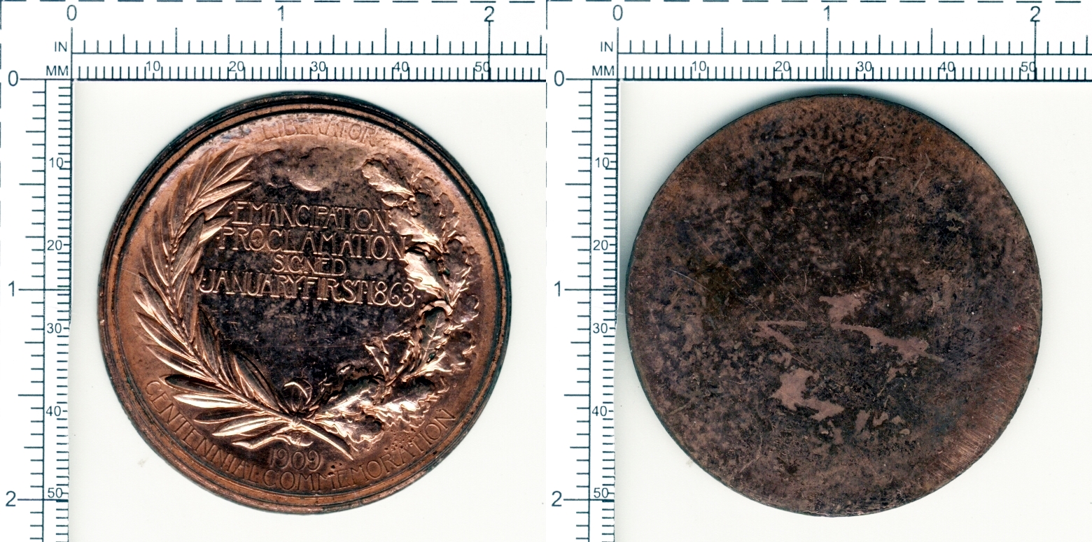 63mm, copper (probably lacquered, as was quite typical), thicker planchet than next medal. A rare Lincoln medal. Nicer high grade!