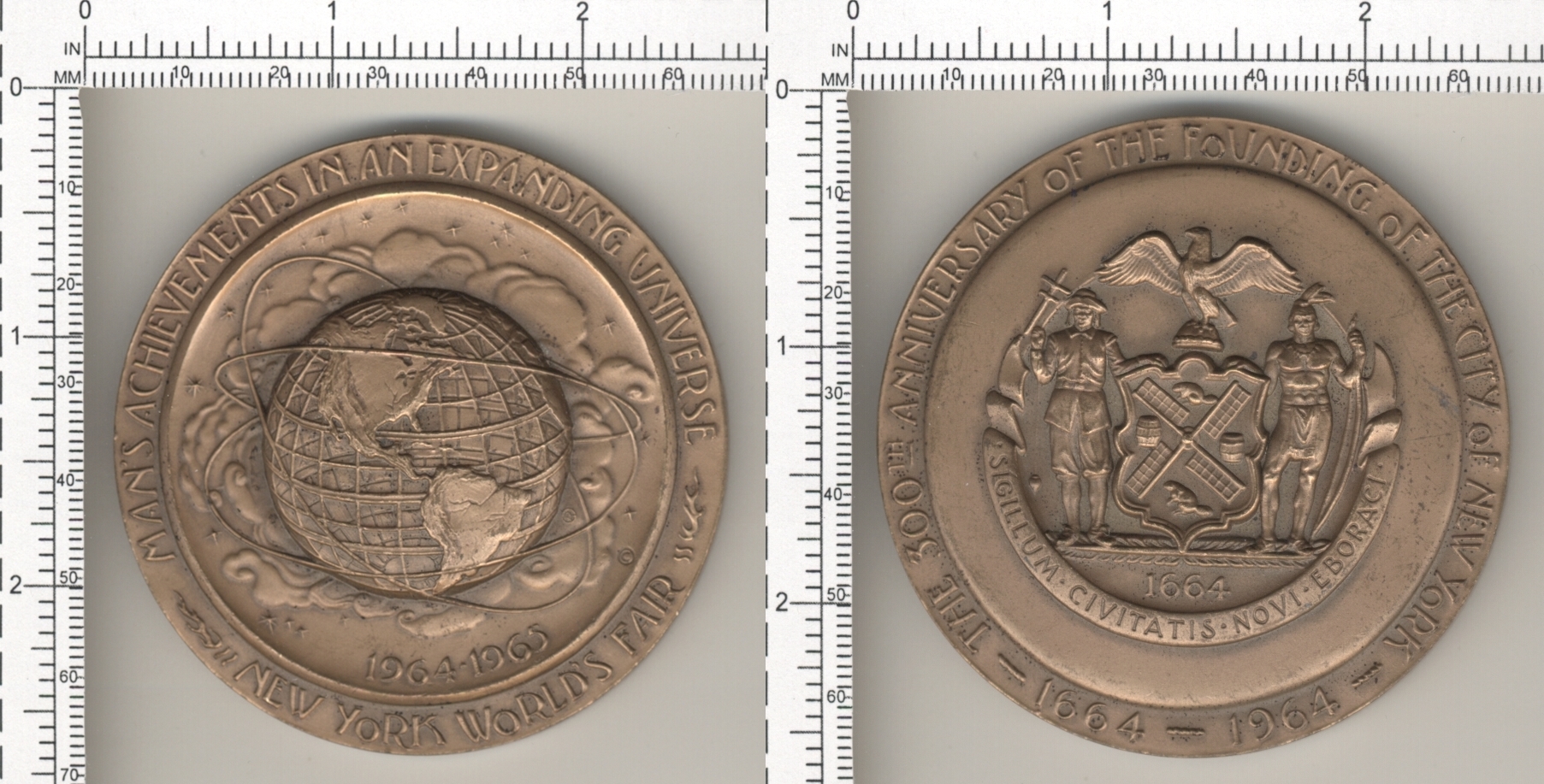 EDGE MARKED "@1961 NEW YORK WORLD'S FAIR 1964-1965 CORPORATION" & "UNISPHERE PRESENTED BY US STEEL", & "MEDALLIC ART CO, NY - BRONZE"