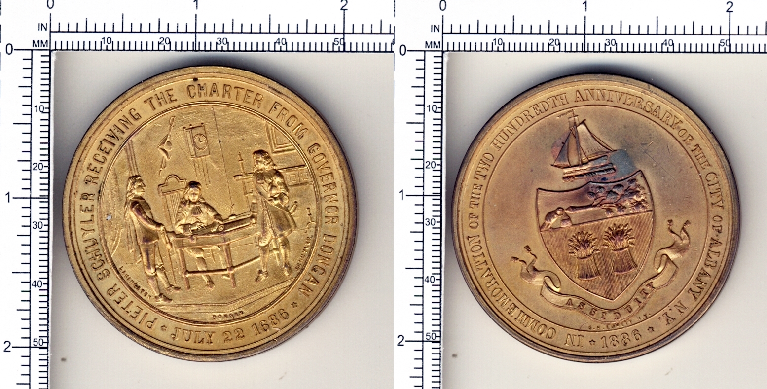 1886, IN COMMEMORATION OF THE ANNIVERSARY OF THE CITY OF ALBANY, N.Y., REVERSE BY GEORGE H. LOVETT, 51mm, GILT - LOW MINTAGE