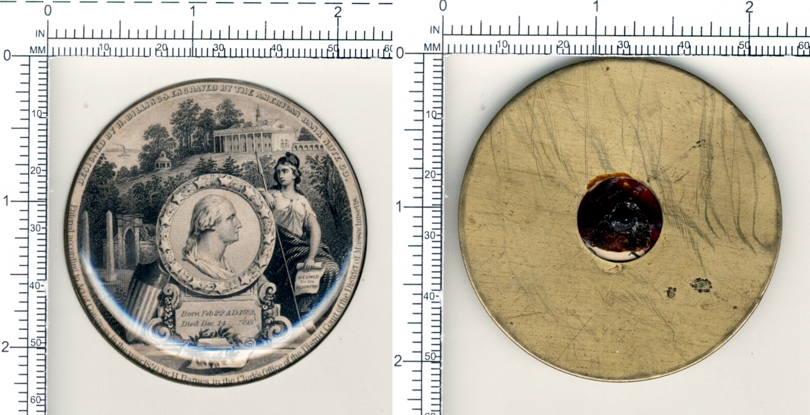 CRUTCHETT PLATE, WASHINGTON'S RESIDENCE,1859, ENGRAVED PRINT MOUNTED ON BRASS DISK, 54.05mm, WITH GLASS COVER, THEN MOUNTED ON ROUND WOODEN PLAQUE. THIS PIECE REMOVED FROM IT'S ORIGINAL WOODEN BASE. PRINT AND GLASS ARE IN EXCELLENT CONDITION. PRINT ENGRAVED BY THE AMERICAN BANKNOTE COMPANY. AN EXTREMELY RARE ITEM.